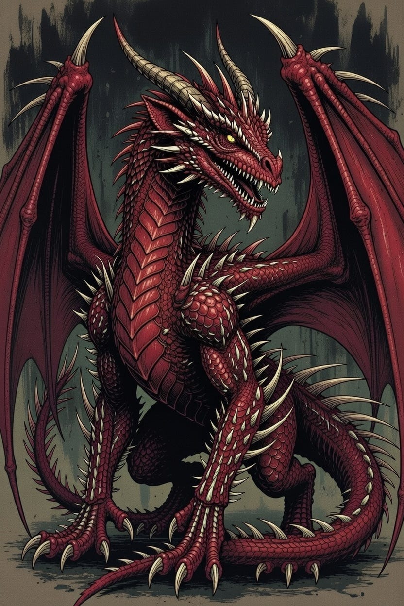 The second dragon was Blood. She was named this because of the blood-red scales that covered her body, but what was more intimidating were the sharp spikes that lined her back and arms. They were all over her body and razor-sharp. At their base were faint stains of blood. Within their cracks and crevices of the spikes were bits of dried flesh from the prey she had recently hunted.