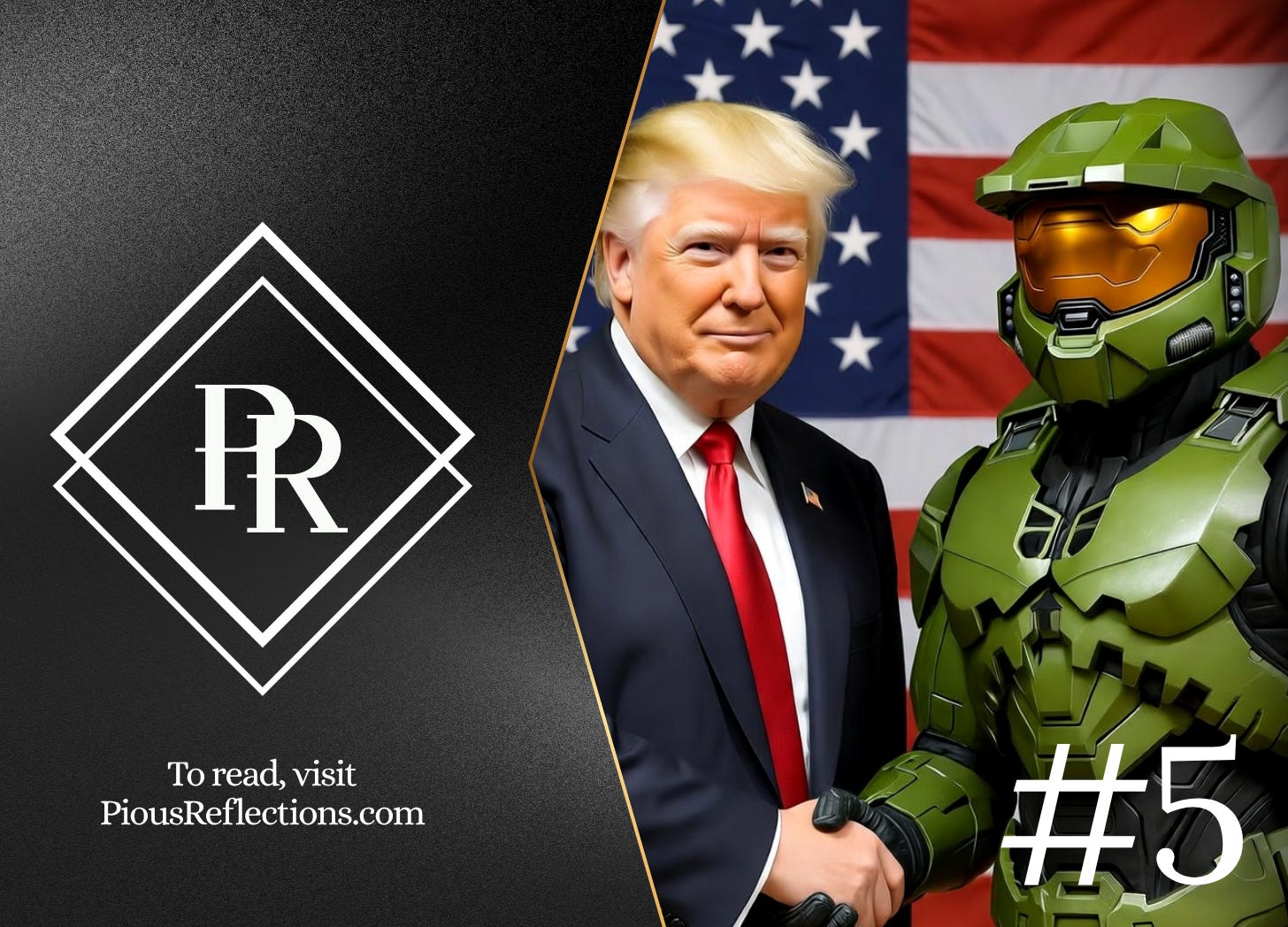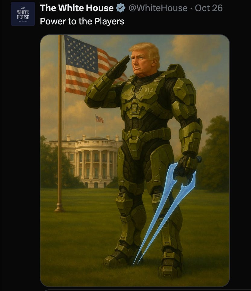 One of the best posts came from the Whitehouse social media accounts. Here, you see the President saluting the flag, wearing the same suit as Master Chief. In the games, you never see Master Chief take off his helmet, and so the Whitehouse appears to be insuniating that the man behind the mask has always been Donald J. Trump. Solid troll…